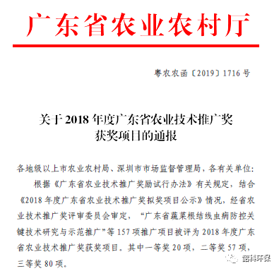 我司作為華南農(nóng)業(yè)大學合作單位之一,參與“修復農(nóng)田土壤污染的能源作物品種篩選及其配套技術(shù)應用項目”取得了良好的綜合效益,根據(jù)《廣東省農(nóng)業(yè)技術(shù)推廣獎勵試行辦法》有關規(guī)定,經(jīng)省農(nóng)業(yè)技術(shù)推廣獎評審委員會審定,該項目獲得2018年度廣東省農(nóng)業(yè)技術(shù)推廣二等獎(粵農(nóng)農(nóng)函〔2019〕1716 號)。